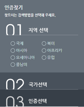 인증찾기 메뉴를 통해 전 세계 인증을 국제, 북미, 아시아, 아프리카,